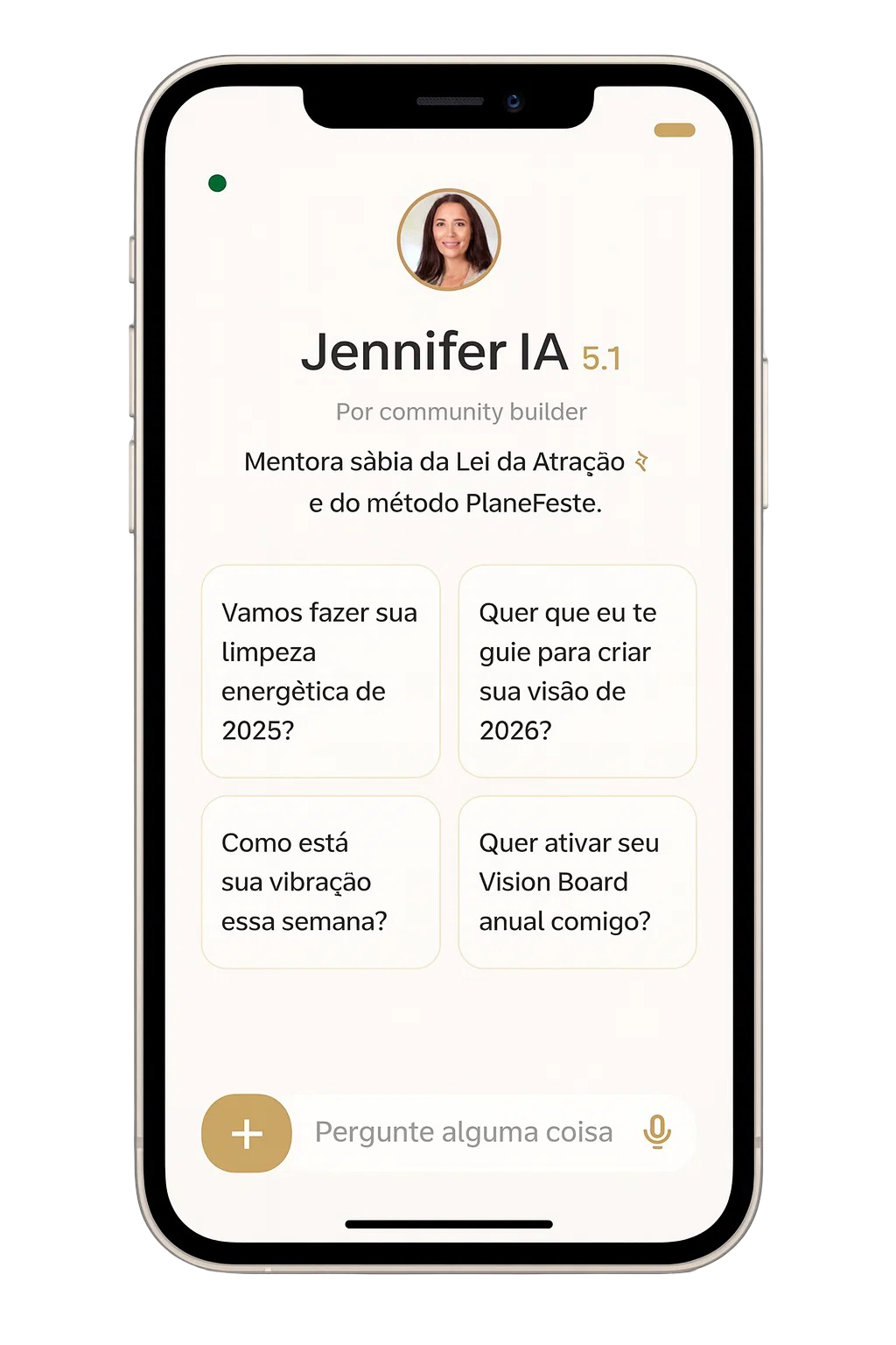 Jennifer IA - Sua Coach Pessoal de Manifestação Nunca mais fique travada sem saber o próximo passo. Tire dúvidas, desbloqueie resistências e receba orientação personalizada a qualquer hora do dia ou da noite. É como ter uma mentora no bolso.