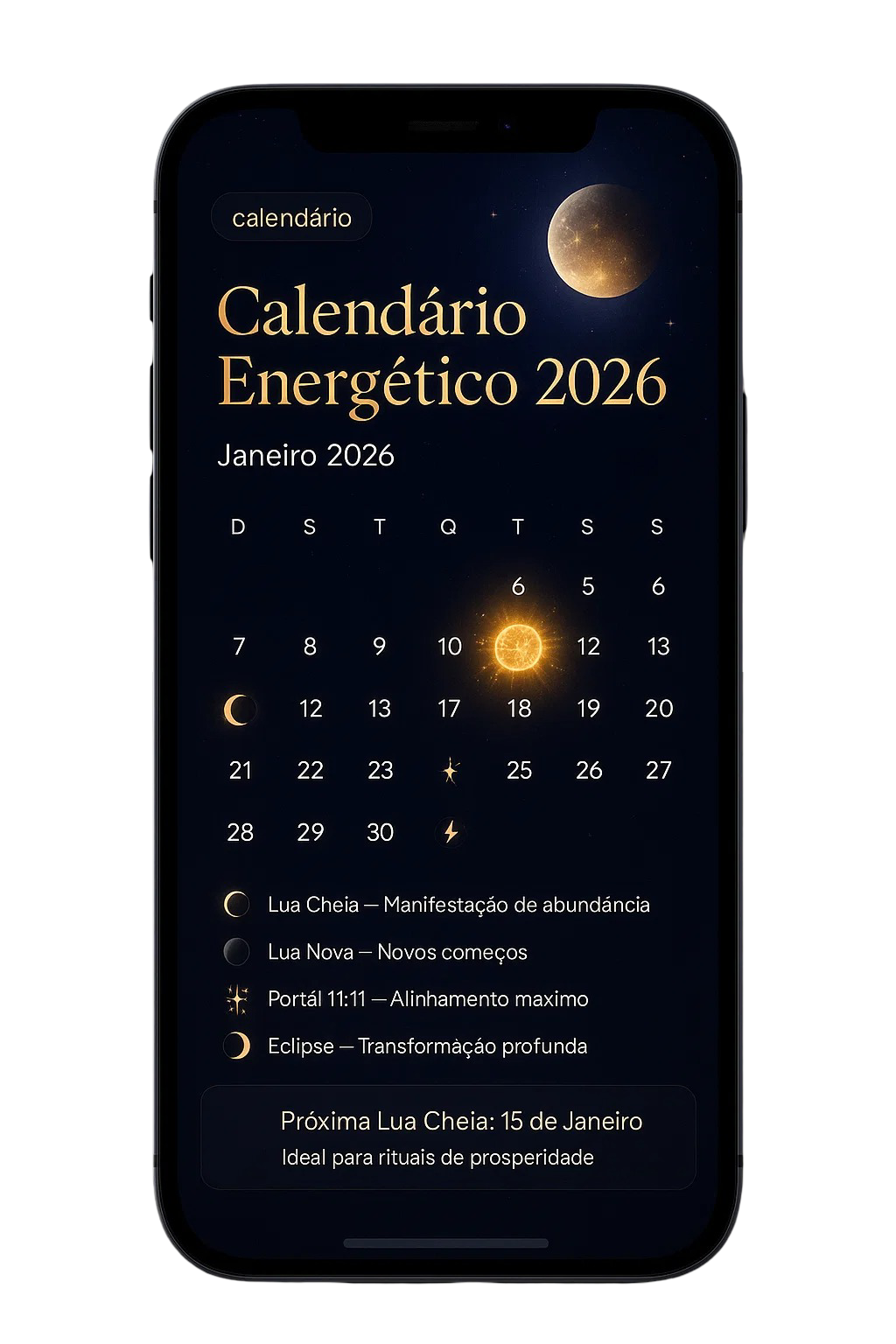 Calendário Energético 2026 Completo Descubra os dias mais poderosos do ano para manifestar cada tipo de desejo. Todas as luas cheias, luas novas, portais e eclipses marcados para você saber exatamente quando fazer cada ritual.
